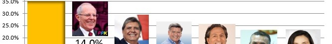 Kuczynski marcha segundo con 14 por ciento y García tercero con 9 por ciento, aunque el aspirante por el partido Peruanos Por el Kambio (PPK) perdió un punto y el líder del Partido Aprista dos puntos.