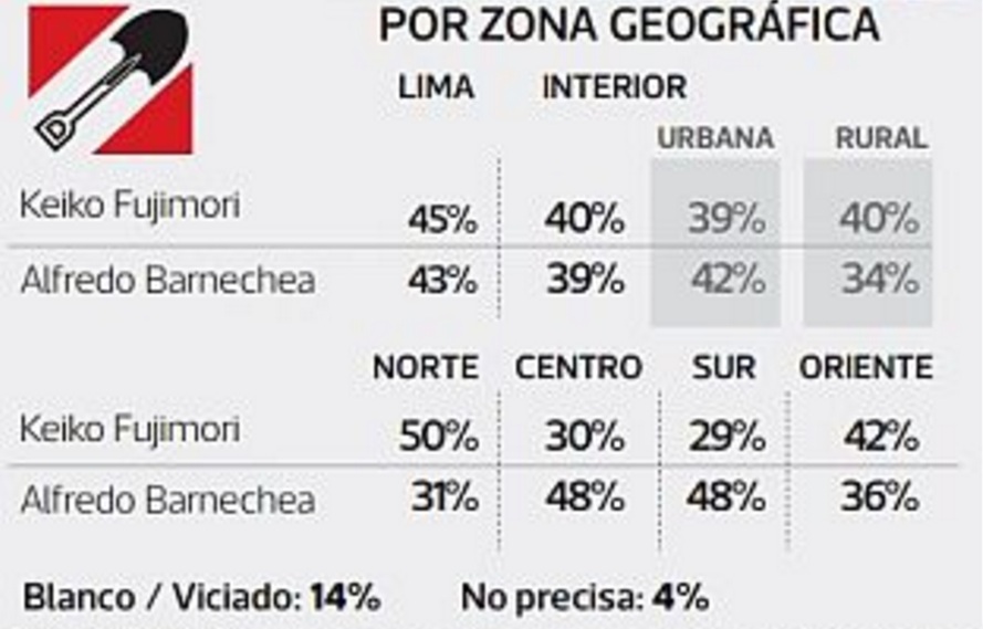 En una eventual segunda vuelta de las elecciones generales del 2016 entre Keiko Fujimori y su contendor de Acción Popular, Alfredo Barnechea, la candidata naranja obtendría 42% mientras que el segundo llegaría a 40%. Un 14% optaría por votar en blanco o viciado y un 4% no define su alternativa.